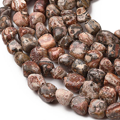 Äkta stenpärlor, formade som ca 5-9mm stora bumlingar/nuggets av naturlig leopardjaspis. Hålstorlek: ca 0,8-1mm.