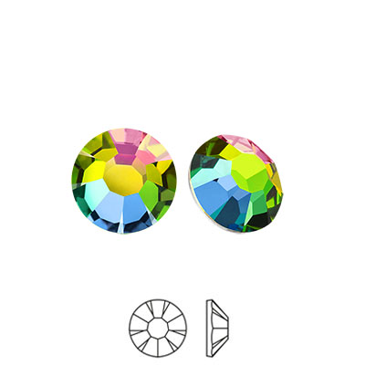 Färg: Crystal Vitrail Medium - en så kallad polykrom nyans där du kan se flera kompletterande färger i kristallens djup. Polykroma färger är rätt svårfotade, bilden gör dem sällan rättvisa och deras exakta utseende kan variera något från leverans till leverans då varje parti är unikt. Bilden är dock ett bra exempel på hur artikeln kan se ut. Folierad baksida förstärker ljusspelet ytterligare.